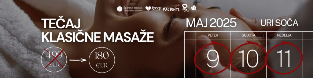 Pacienti Zdravstvene fakultete in Študentski svet Zdravstvene fakultete za vas pripravljamo poučen strokovni tečaj klasične masaže. Tečaj bo potekal od petka, 9. maja, do nedelje, 11. maja 2025. 📜 Ob zaključku tečaja prejmete potrdilo …