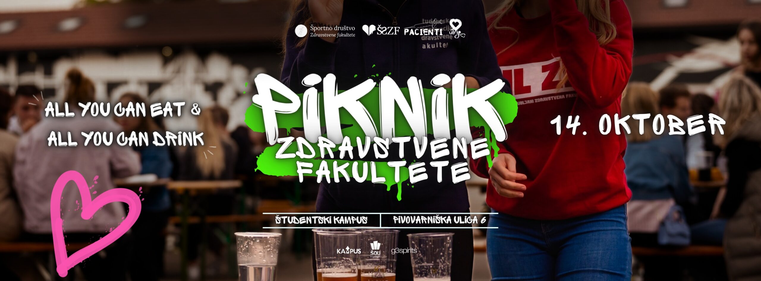Študentski kampus Pivovariniška ulica 6, LjubljanaDrage študentke in dragi študenti Zdravstvene fakultete! Počitnice so se končale in pred vami je novo življenjsko obdobje. Da bo prehod čim lažji in da spoznate čim več novih ljudi, smo za vas pripravili dogodek, ki ga ne smete zamuditi: 𝟰. 𝗣𝗜𝗞𝗡𝗜𝗞 𝗭𝗗𝗥𝗔𝗩𝗦𝗧𝗩𝗘𝗡𝗘 𝗙𝗔𝗞𝗨𝗟𝗧𝗘𝗧𝗘! 𝗔𝗟𝗟 𝗬𝗢𝗨 𝗖𝗔𝗡 𝗘𝗔𝗧 & 𝗔𝗟𝗟 𝗬𝗢𝗨 𝗖𝗔𝗡 𝗗𝗥𝗜𝗡𝗞 pa velja …